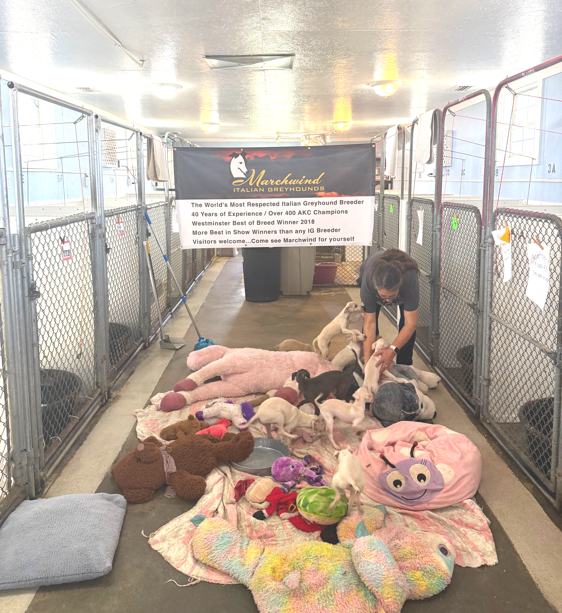 ALL THE PUPPIES IN THE MAIN KENNEL BUILDING FROM 4 WEEKS OLD TO 10 WEEKS OLD ARE TURNED LOOSE WITH A SNACK, STUFFED ANIMALS, LOTS OF TOYS AND PEOPLE TO PLAY WITH. THIS IS AN IMPORTANT PART OF PUPPY SOCIALIZATION.